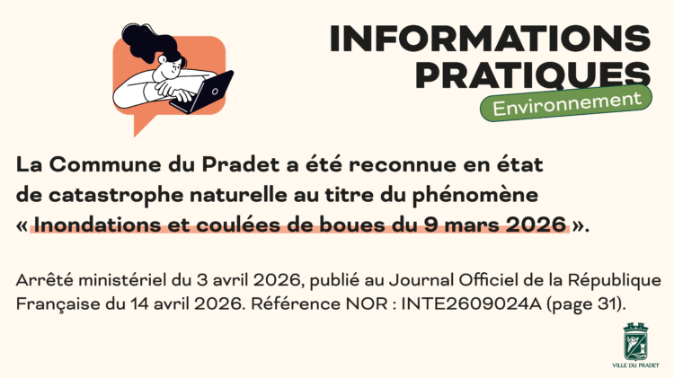 La Commune du Pradet a été reconnue en état de catastrophe naturelle au titre du phénomène « Inondations et coulées de boues du 9 mars 2026 ».