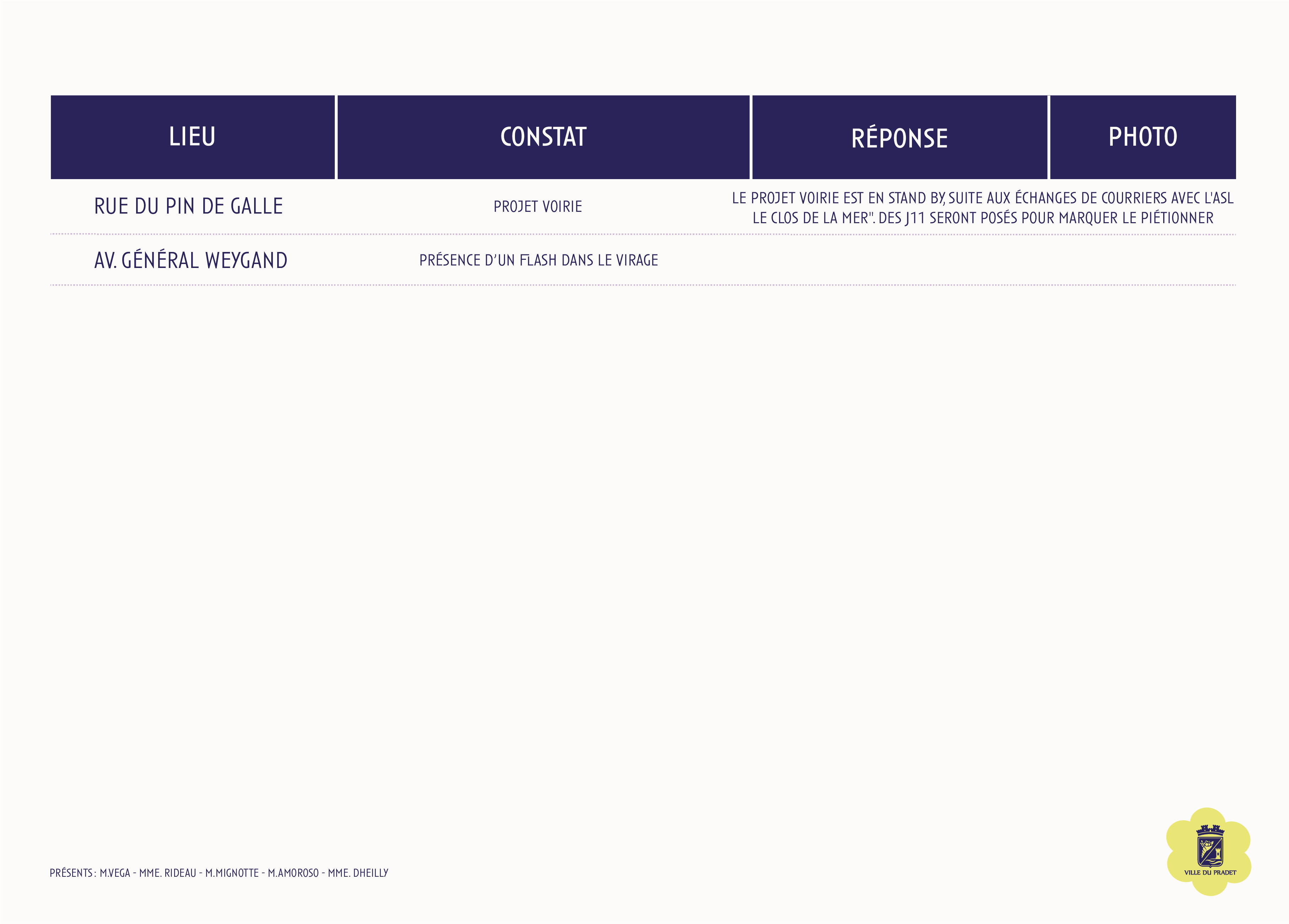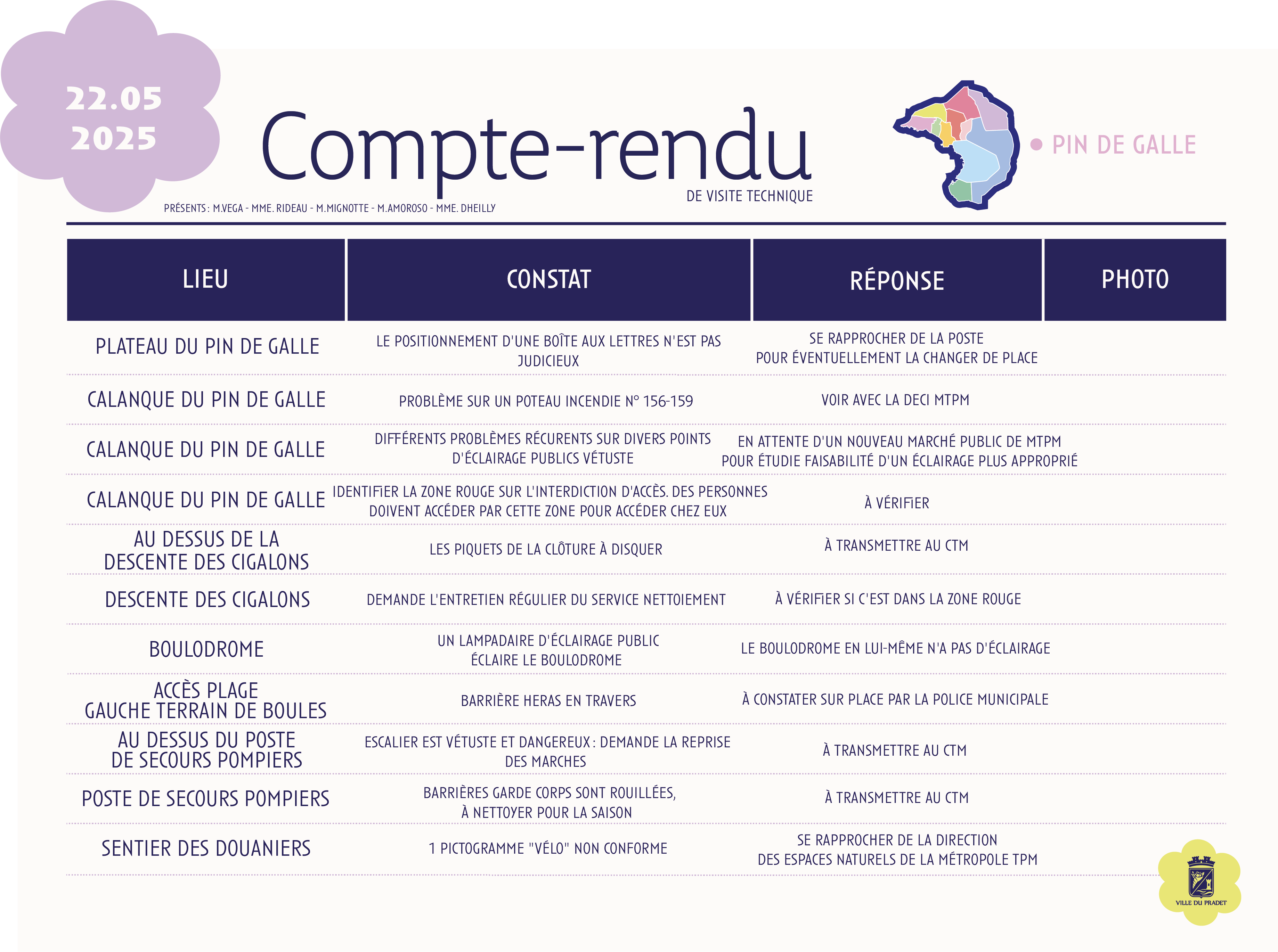 Sur cette page, retrouvez les comptes rendus des visites de quartier du Pin de Galle, qui présentent les constats réalisés sur le terrain ainsi que les actions envisagées ou mises en œuvre par la commune, dans une démarche de proximité et de transparence.