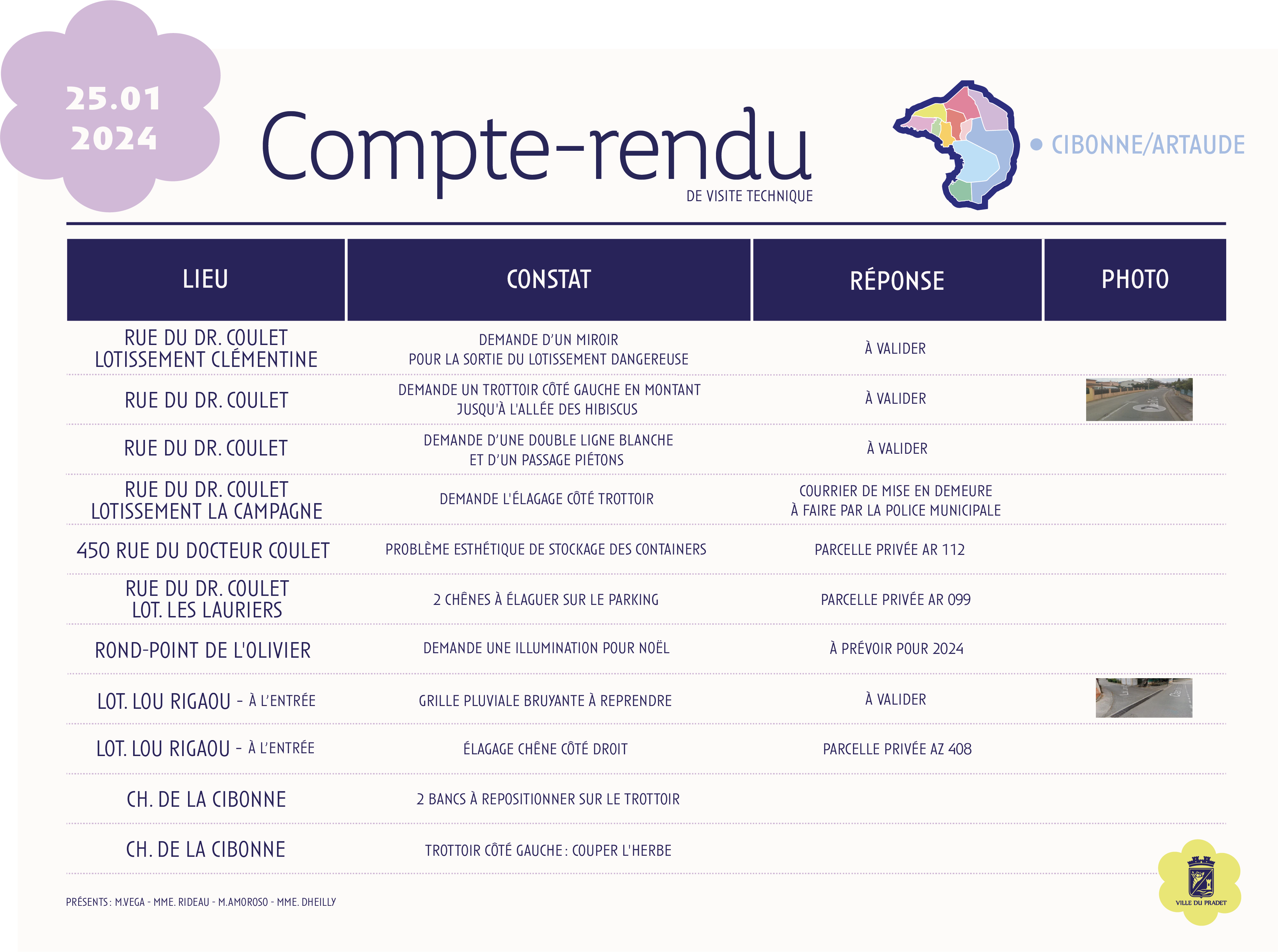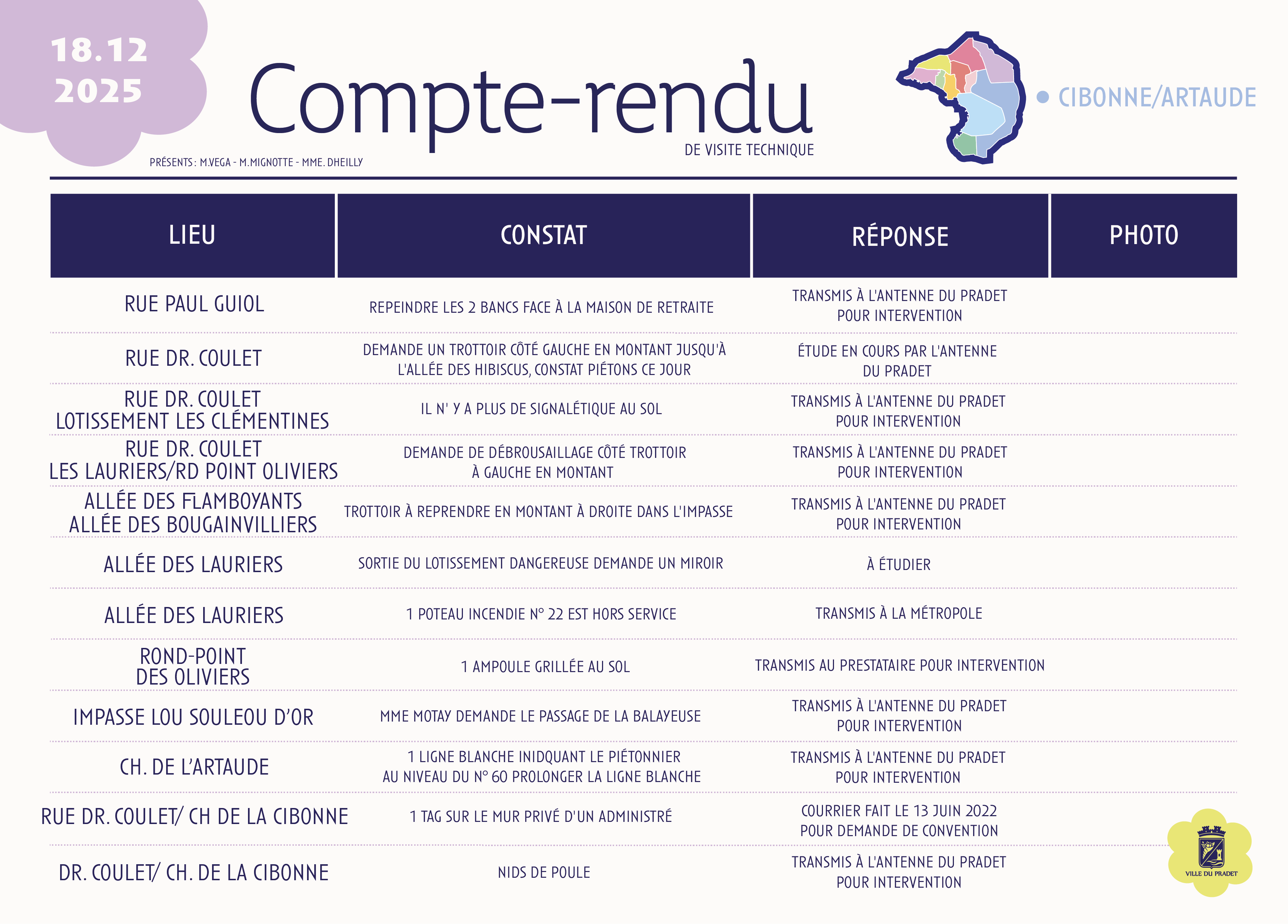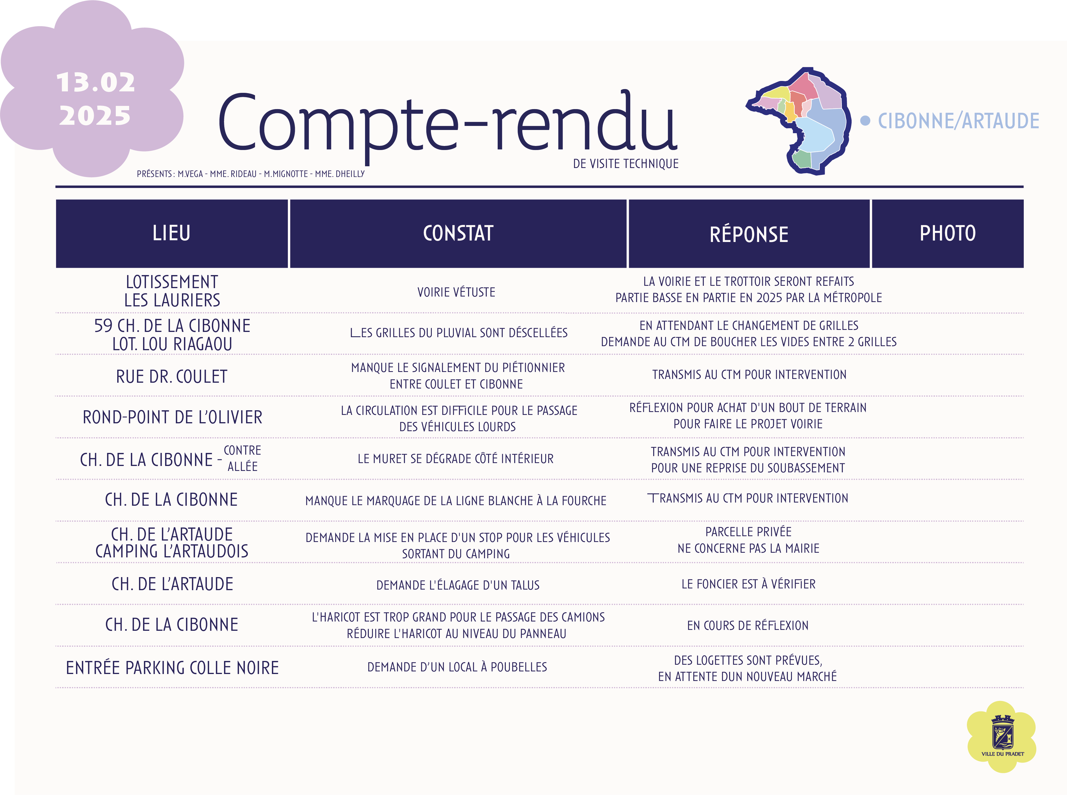 Sur cette page, retrouvez les comptes rendus des visites de quartier de La Cibone/Artaude, qui présentent les constats réalisés sur le terrain ainsi que les actions envisagées ou mises en œuvre par la commune, dans une démarche de proximité et de transparence.