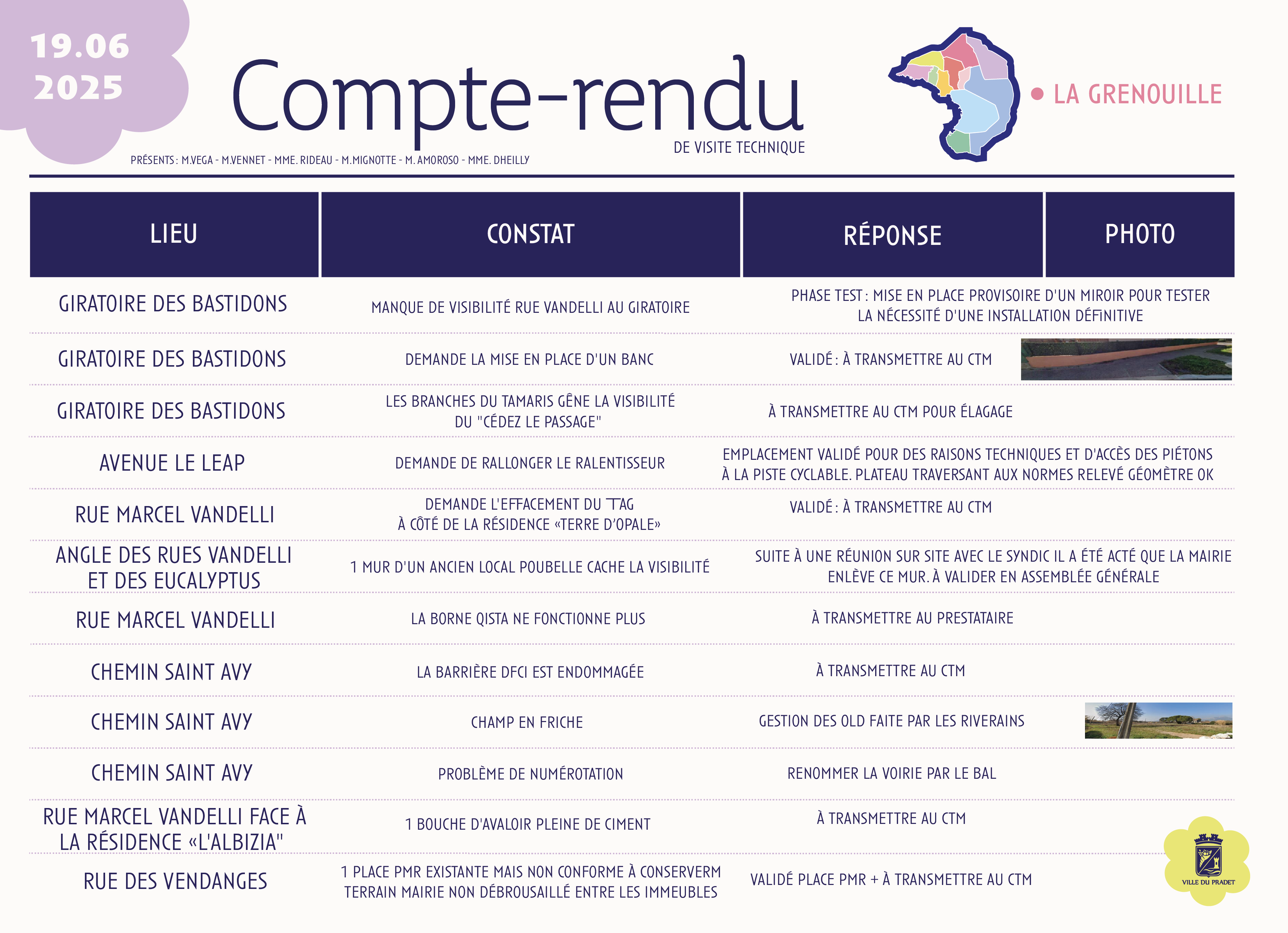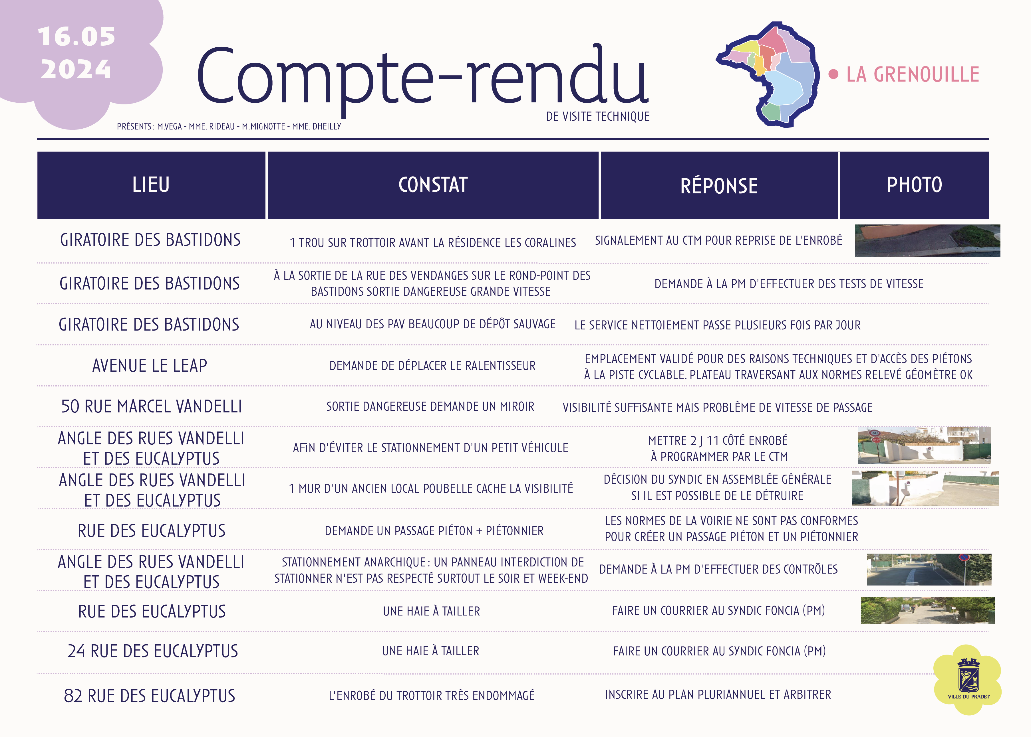 Sur cette page, retrouvez les comptes rendus des visites du quartier de La Grenouille, qui présentent les constats réalisés sur le terrain ainsi que les actions envisagées ou mises en œuvre par la commune, dans une démarche de proximité et de transparence.