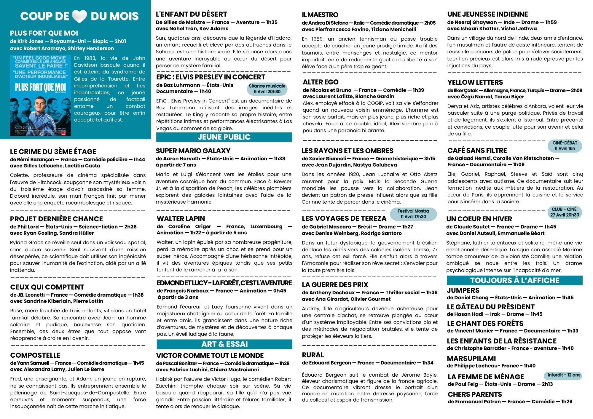 • 1€ pour la location de lunettes 3D en séance 3D, louées pour la durée de la séance