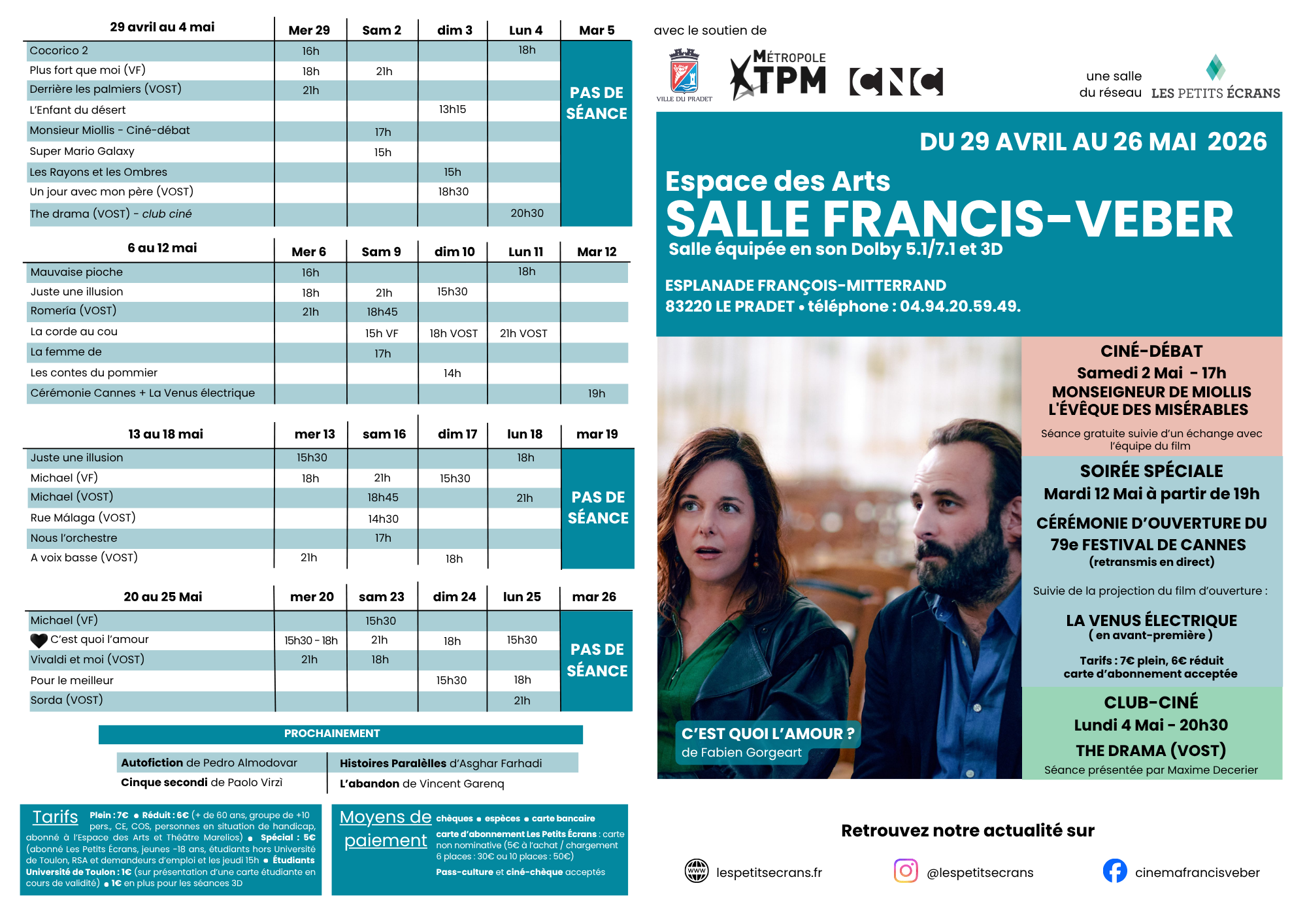 - 1€ pour la location de lunettes 3D en séance 3D, louées pour la durée de la séance