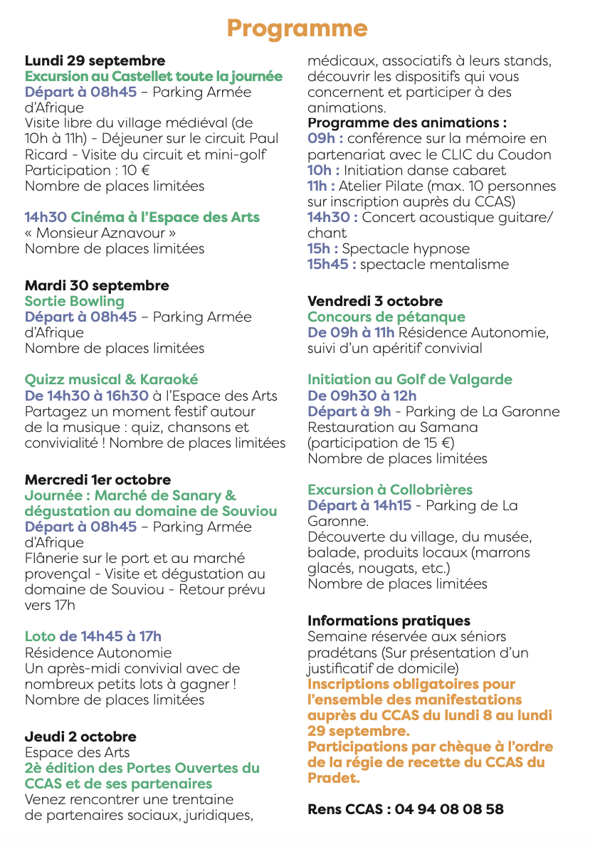 Le CCAS du Pradet organise la Semaine de l’Âge d’Or, du lundi 29 septembre au vendredi 3 octobre, avec un programme riche en sorties, animations, découvertes et moments de convivialité, réservé aux seniors pradétans.