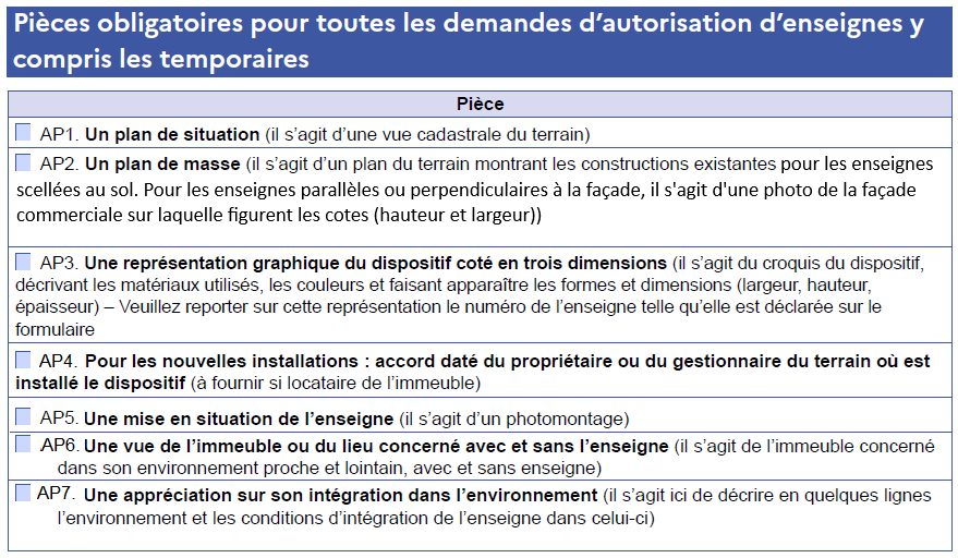 Tout remplacement ou nouvelle installation d’enseigne commerciale, préenseigne ou publicité doit faire l’objet d’un dépôt en Mairie d’une demande d’autorisation préalable ou d’une déclaration préalable via le formulaire Cerfa dédié et accompagné des pièces nécessaires à l’instruction de la demande (cf. formulaires et notice d’accompagnement ci-contre).